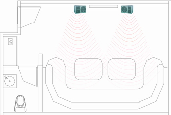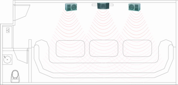 ,从声音效果上,能够使声音的密度感更好,声场更加宽阔,能够很好的营造出临场感和现场气氛。传统模式和三声道模式的声场比较示意如下左图(方框区域代表房间,曲线代表声波的传输):从下左图明显可以看到,采用三声道方式后,声场的均衡度大大增加,声音的也得到了增强。采用该工作方式后,不但歌唱时倍感轻松,现场感更好,更可灵活切换中间声道工作模式,使其适应独唱、合唱、清唱、电影、DISCO等不同工作模式。